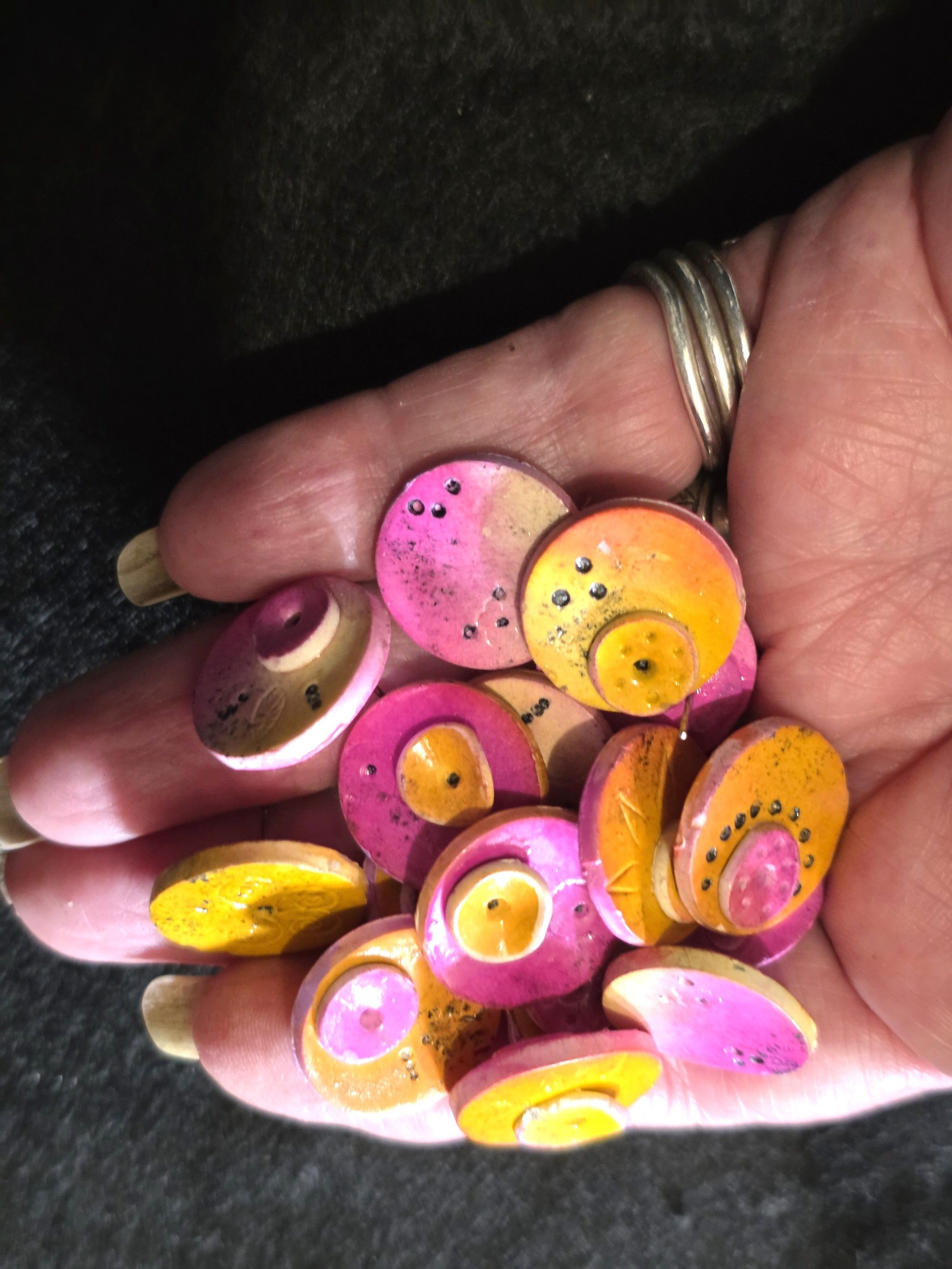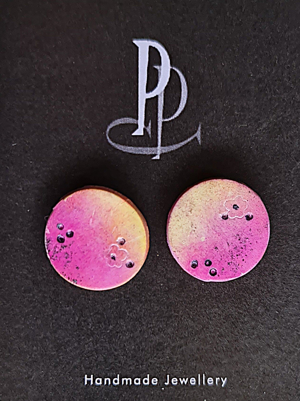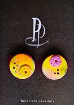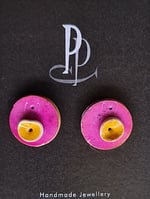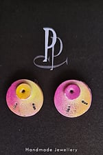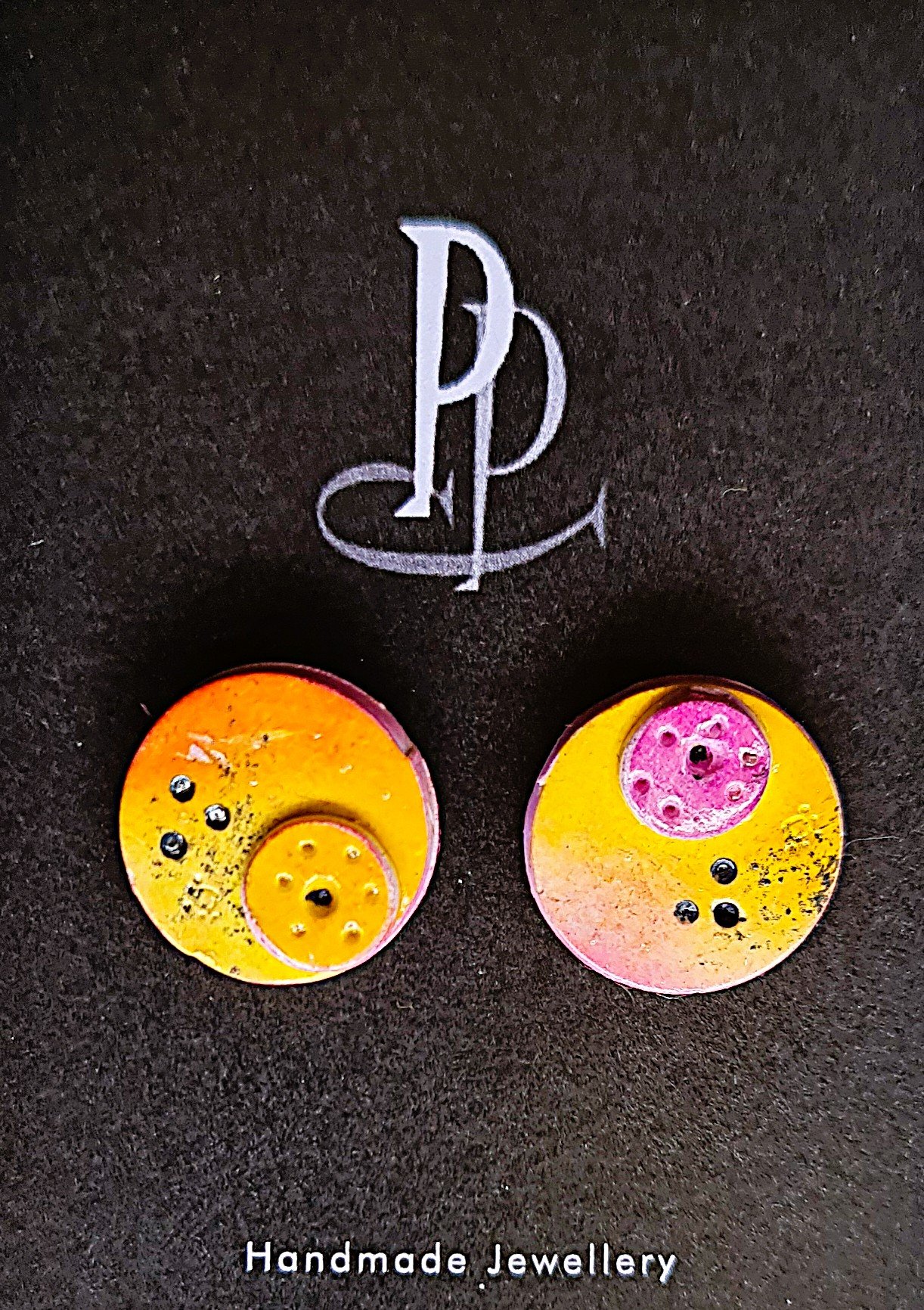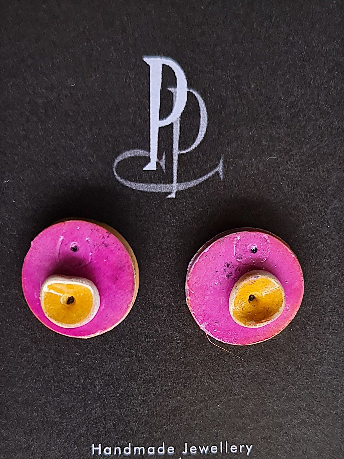 Contemporary handmade Stud Earrings for a bit of lighthearted fun. These little pieces of art are bright Summer styled in tones of Yellows and Pinks with a sprinkle of black and have been varnished to a satin sheen.