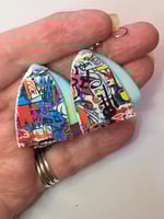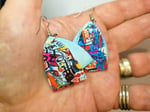 Contemporary and colourful handmade and hand painted 2 part earrings for a bit of bright and light hearted fun. Each little piece of art has layers of colour and is varnished to a satin sheen.
