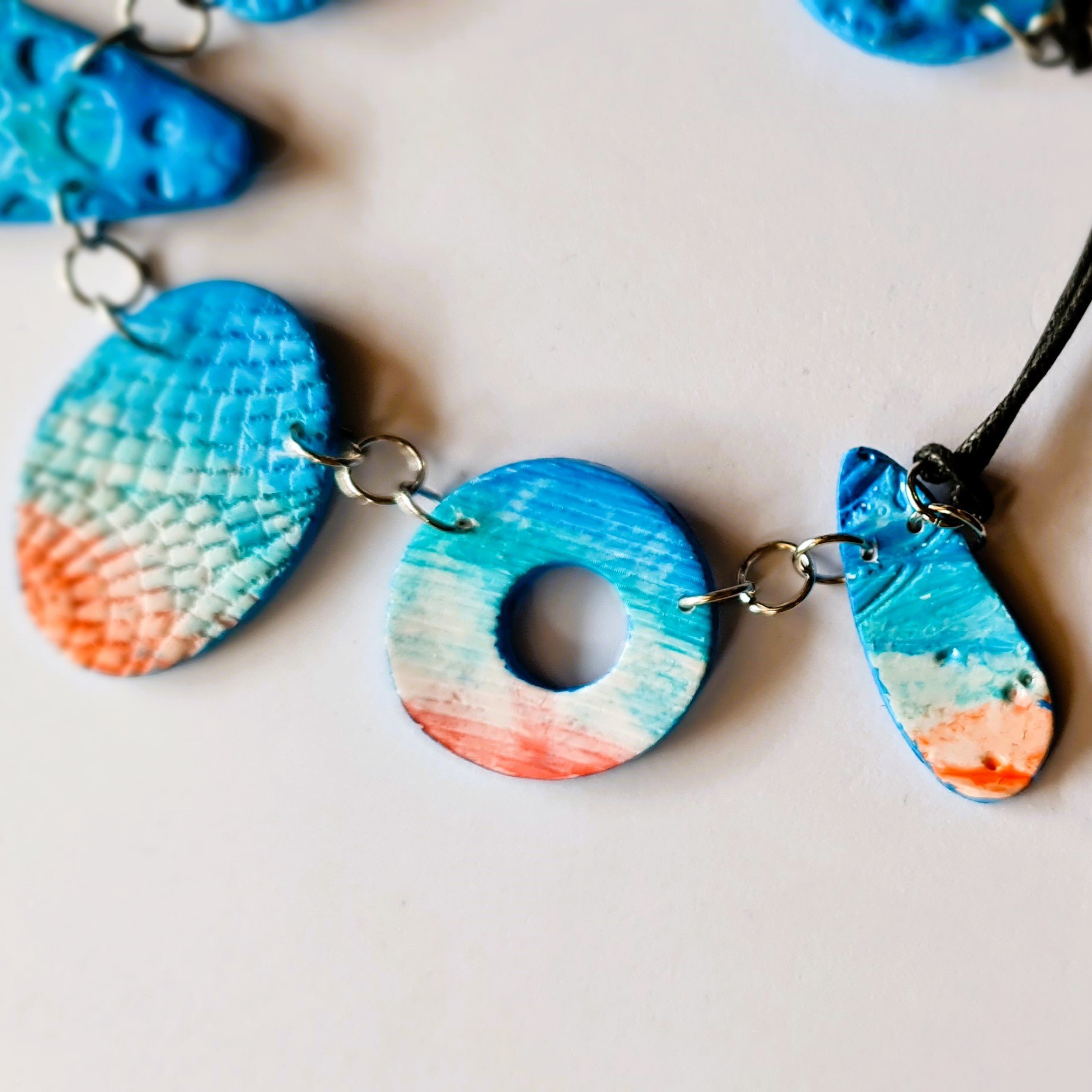 Contemporary and colourful handmade and hand painted necklace in beautiful summer colours for a bit of bright and light hearted fun. Each little piece of art has layers of texture and colour and has been varnished to a satin sheen. An excellent gift or something special to brighten your day.