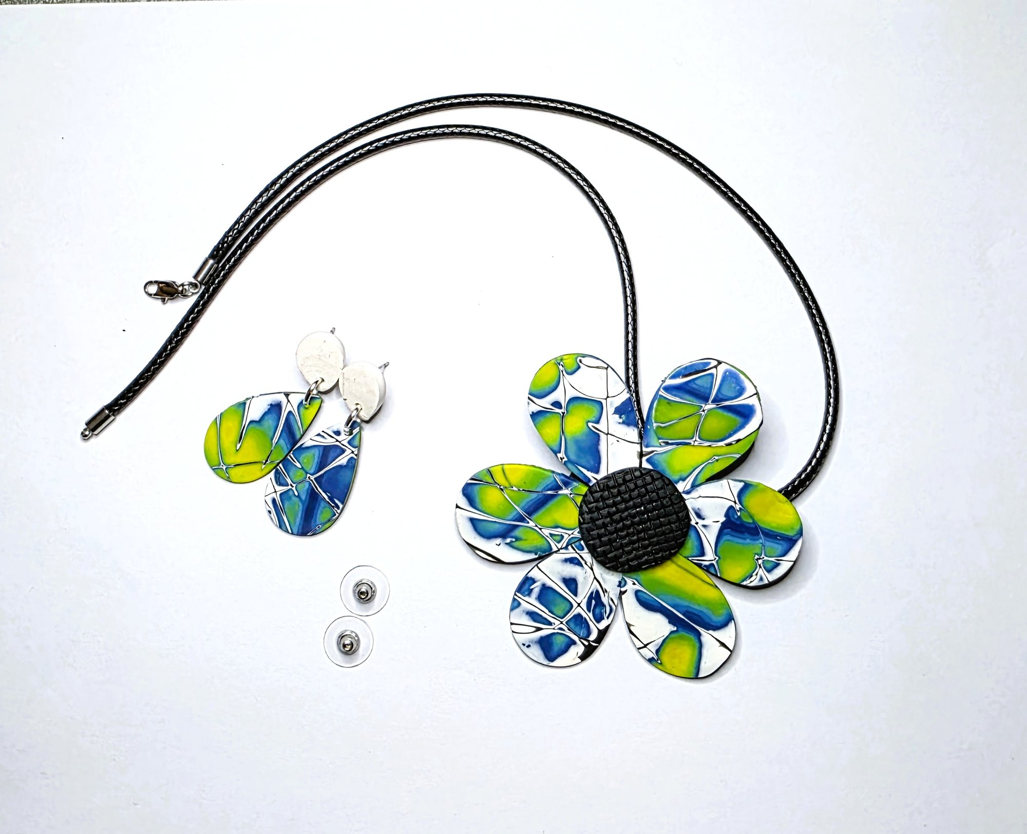 This 50cm long black cord necklace features a large 6 petal flower of handmade petals with a central black round, features stainless-steel findings, its light weight and easy care. The necklace sits just below the collar bone and looks great under a shirt collar for the office or with a more casual top for that outing with friends, with matching stud drops your outfit is complete.
