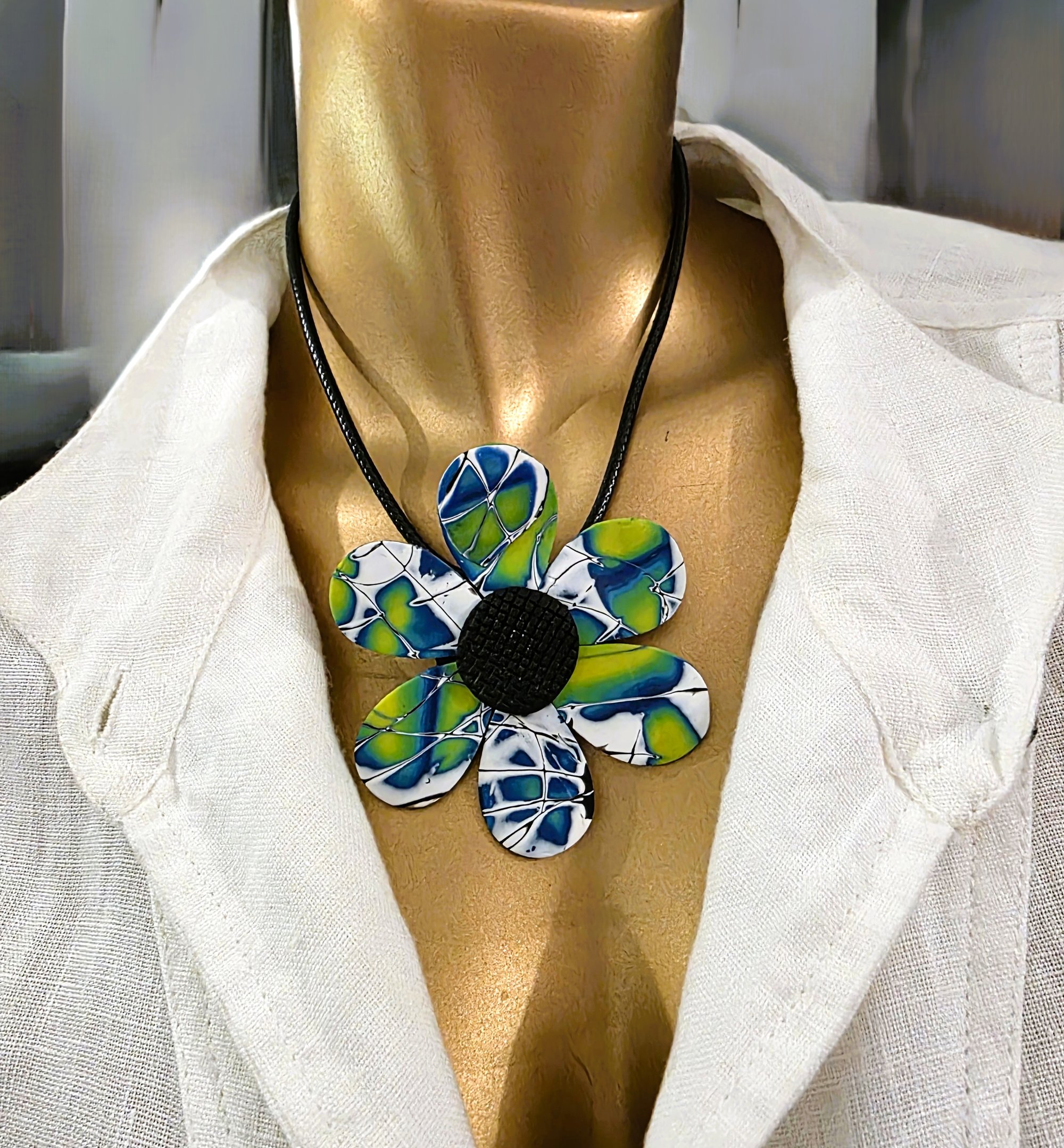 Contemporary modern style, this Flower Power Necklace is one of a kind crafted from Polymer Clay so it is light weight too. Comfortable for all-day wear, while the playful design adds a pop of colour and personality to your outfit.