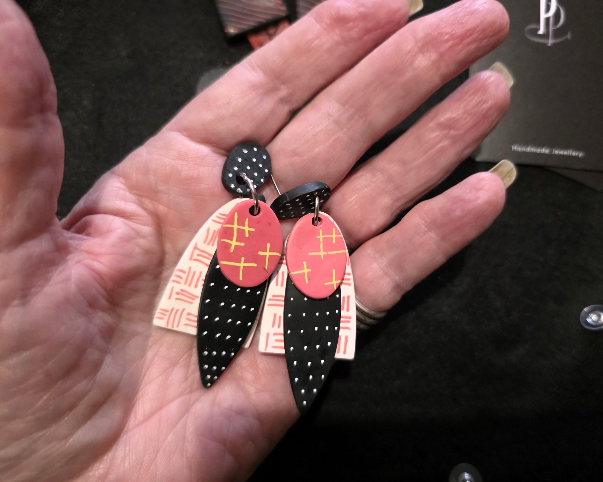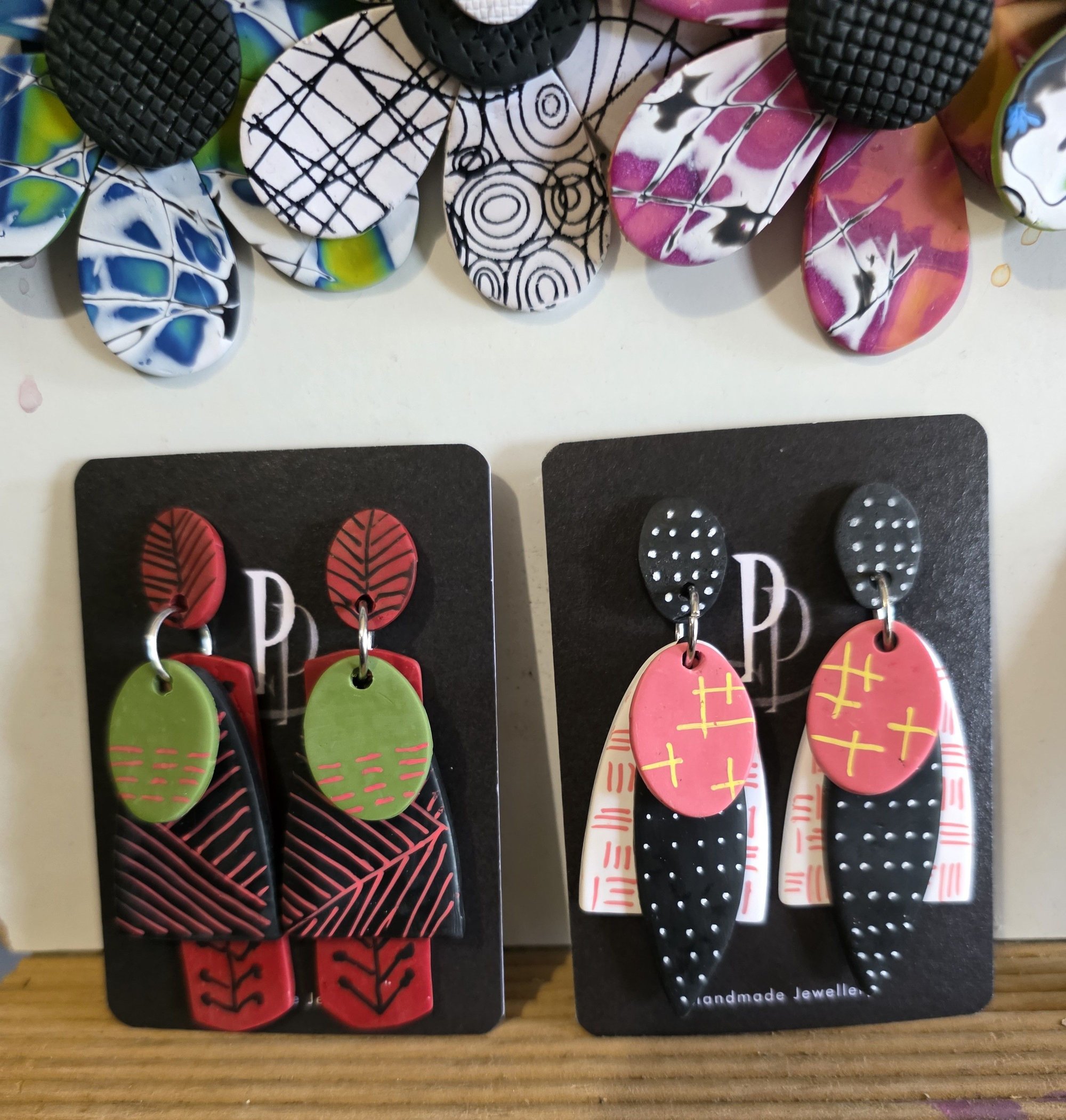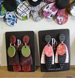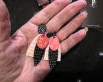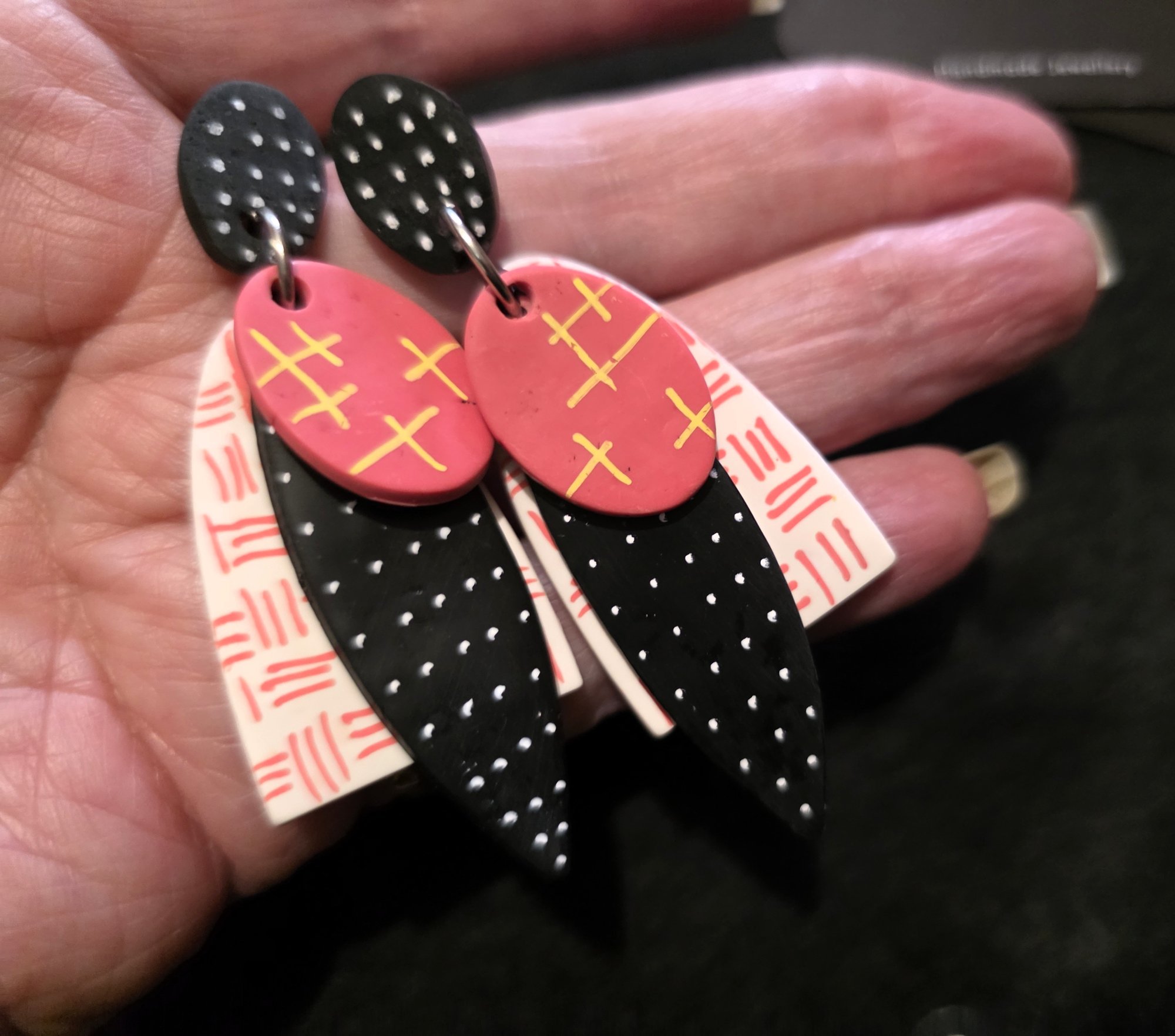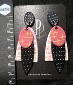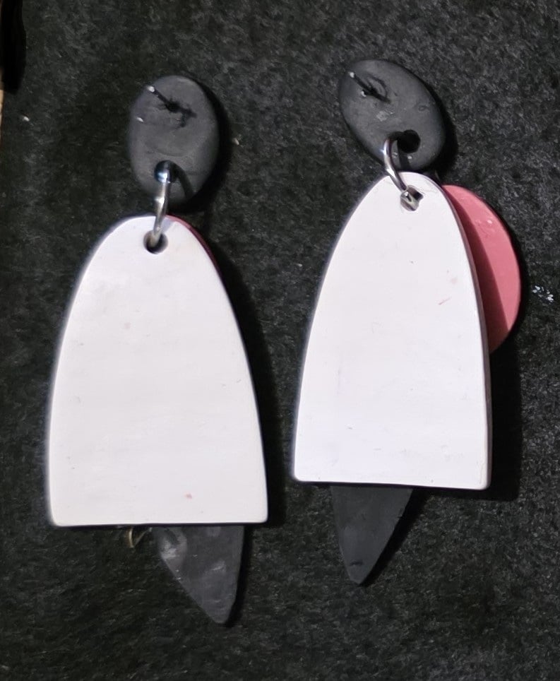 Want to stand out in the crowd, these will sort that out, Polymer Clay Stackers in White, Black and Coral and decorated with complimentary colours, they have been varnished to a satin sheen. Light weight and lighthearted.