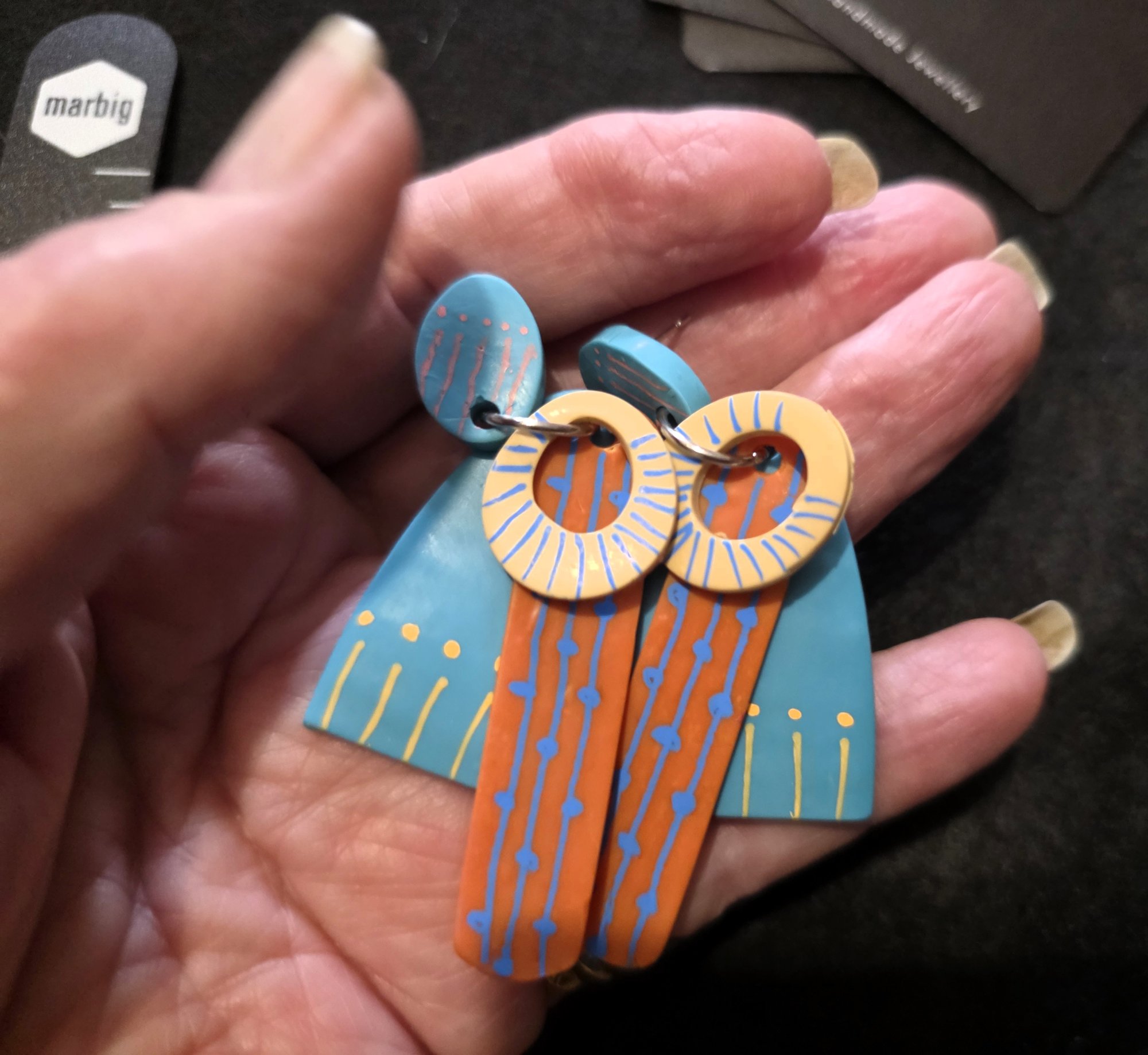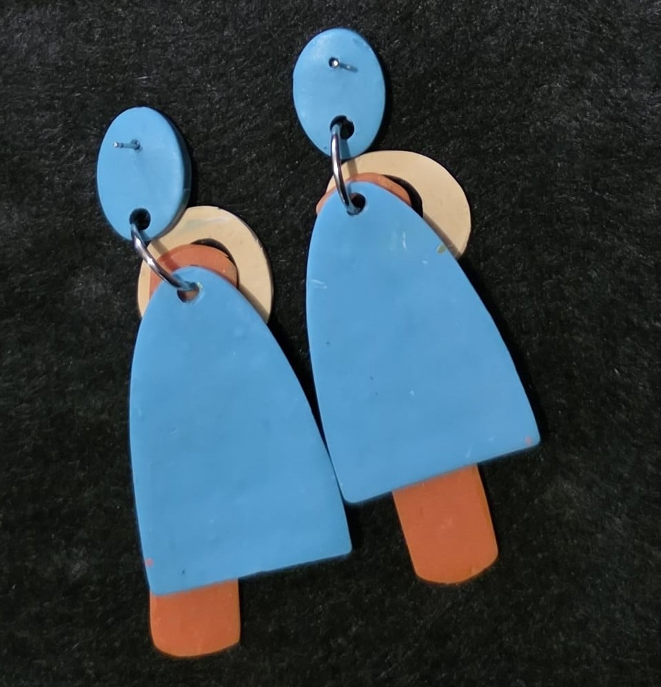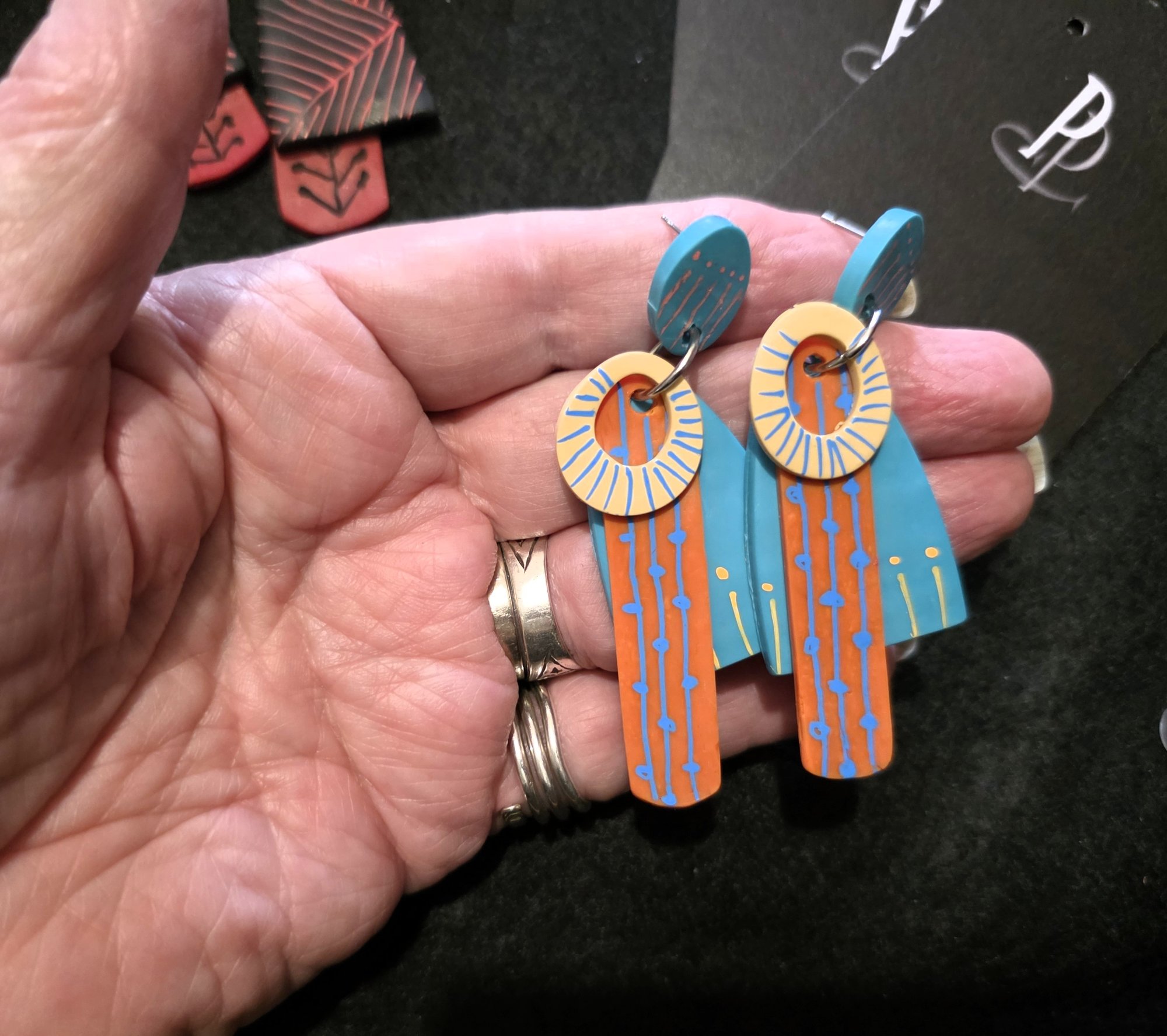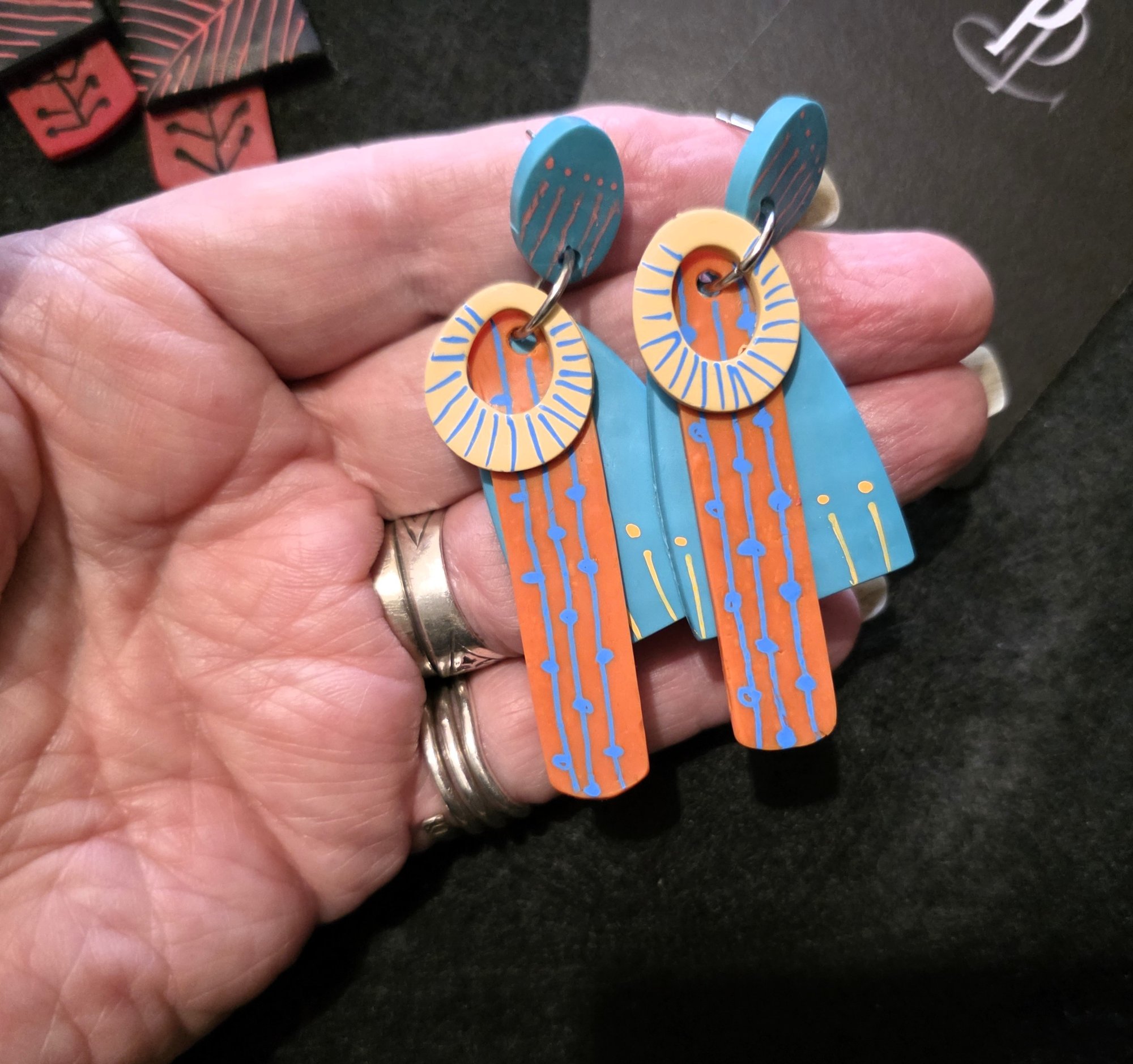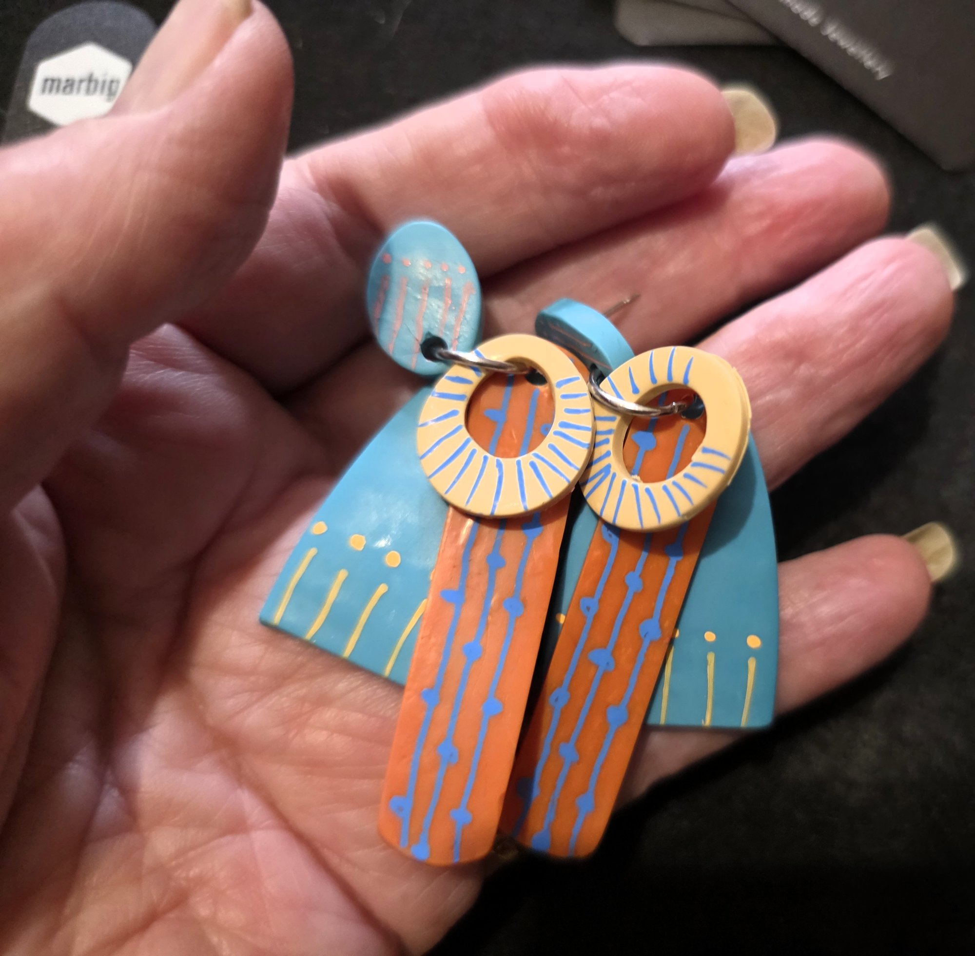 Want to stand out in the crowd, these will sort that out, Polymer Clay Stackers in Turquoise, Burnt Orange and Ecru and decorated with complimentary colours, they have been varnished to a satin sheen. Light weight and lighthearted.