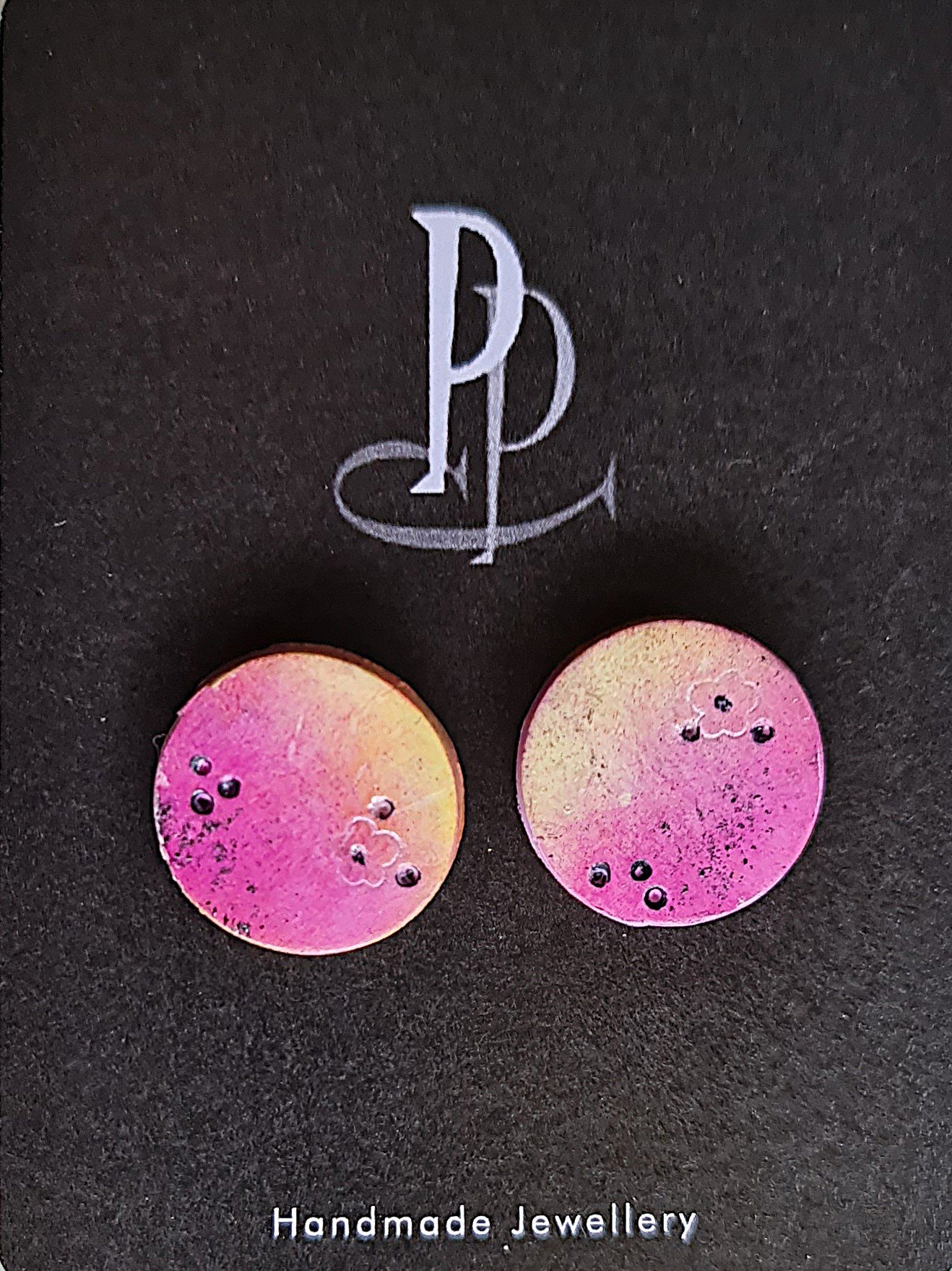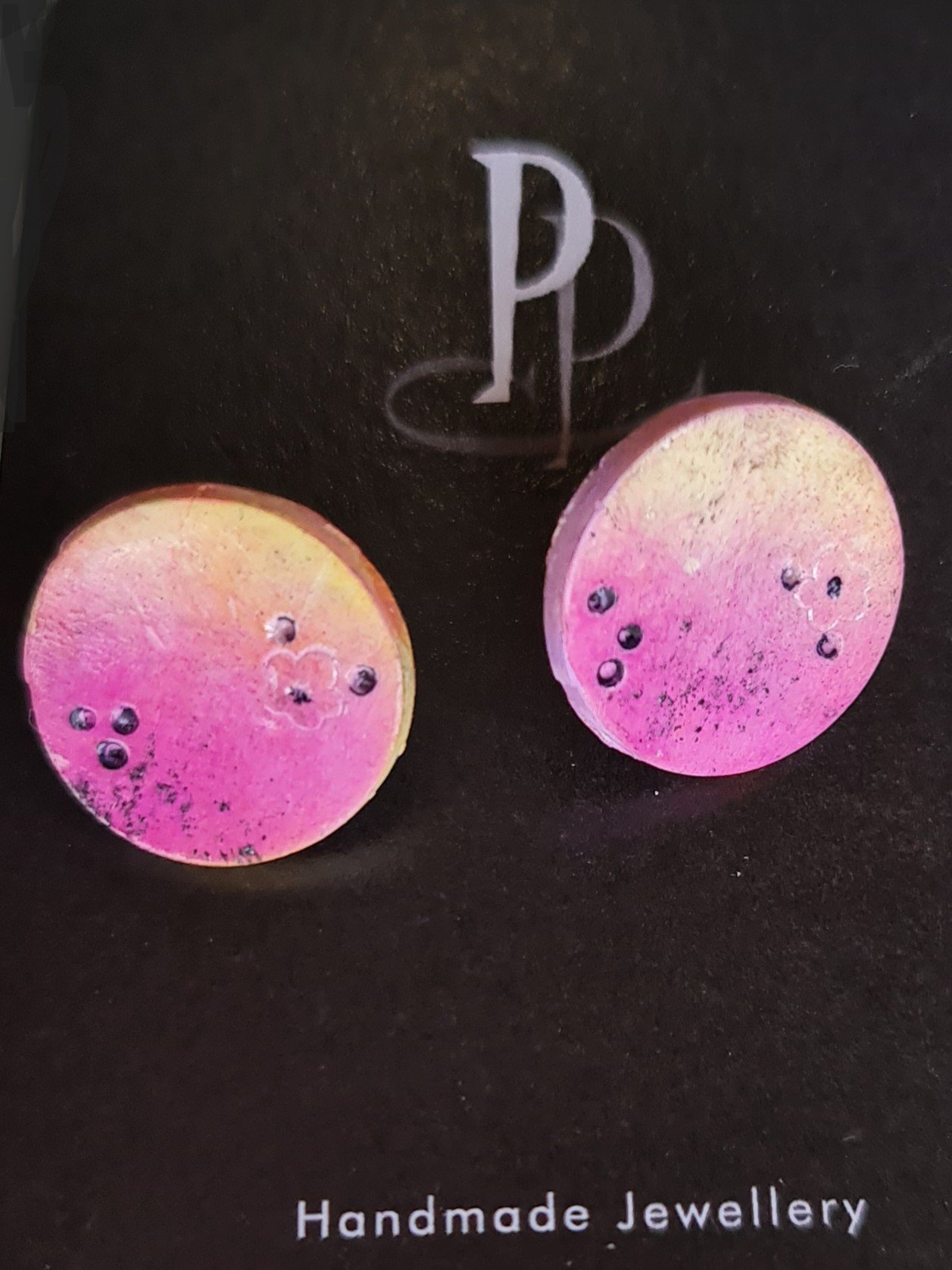 Contemporary handmade Stud Earrings for a bit of lighthearted fun. These little pieces of art are bright Summer styled tones of Yellows and Pinks with a sprinkle of black and have been varnished to a satin sheen.