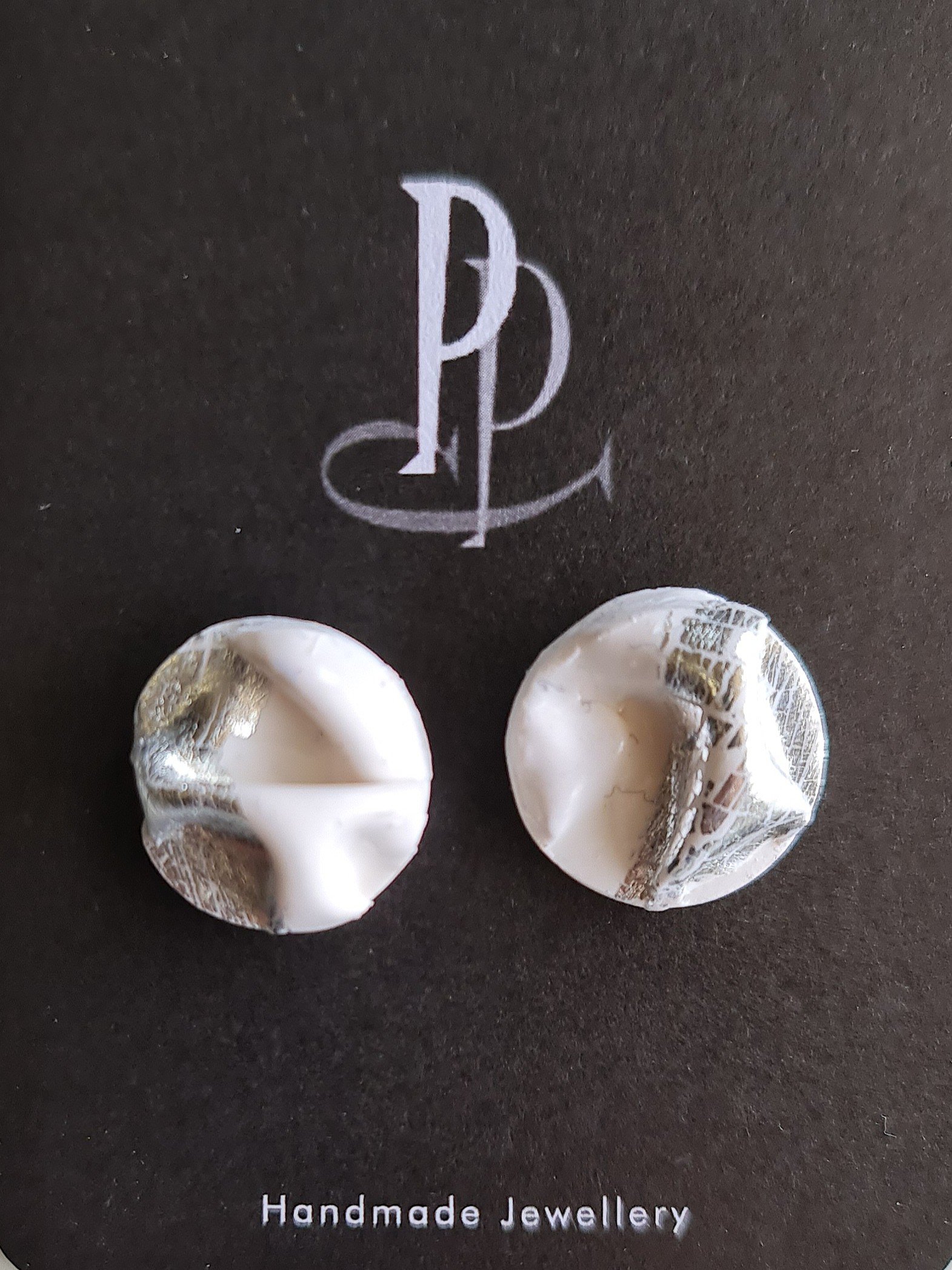 Contemporary handmade Stud Earrings for a bit of light hearted fun. These little pieces of art are folded White clay with an overlay of crackled silver foil for a bit of flash and have been varnished to a satin sheen.