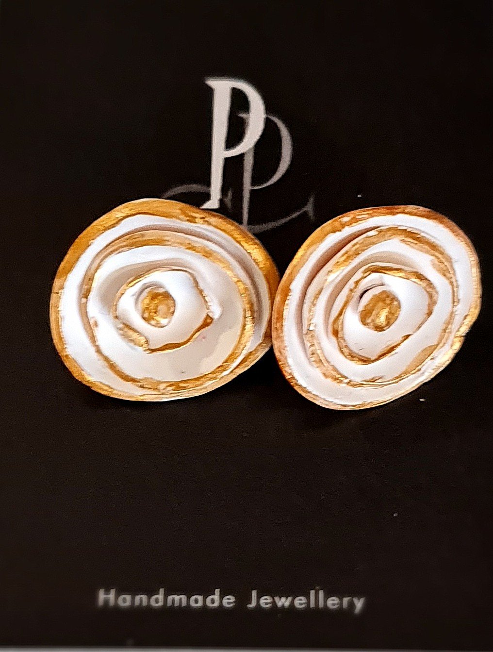 Contemporary handmade and hand painted Stud Earrings for a bit of light hearted fun. Each little piece of art has a white base with gold highlighted rims and has been varnished to a satin sheen.