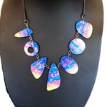 Contemporary and colourful handmade and hand painted necklace in beautiful Twilight colours for a bit of bright and light hearted fun. Each little piece of art has layers of texture and colour and has been varnished to a satin sheen. An excellent gift or something to brighten your day.